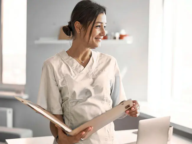 Frau in medizinischer Arbeitskleidung hält eine Patientenakte in einer hellen Praxis mit Laptop und Regalen im Hintergrund.